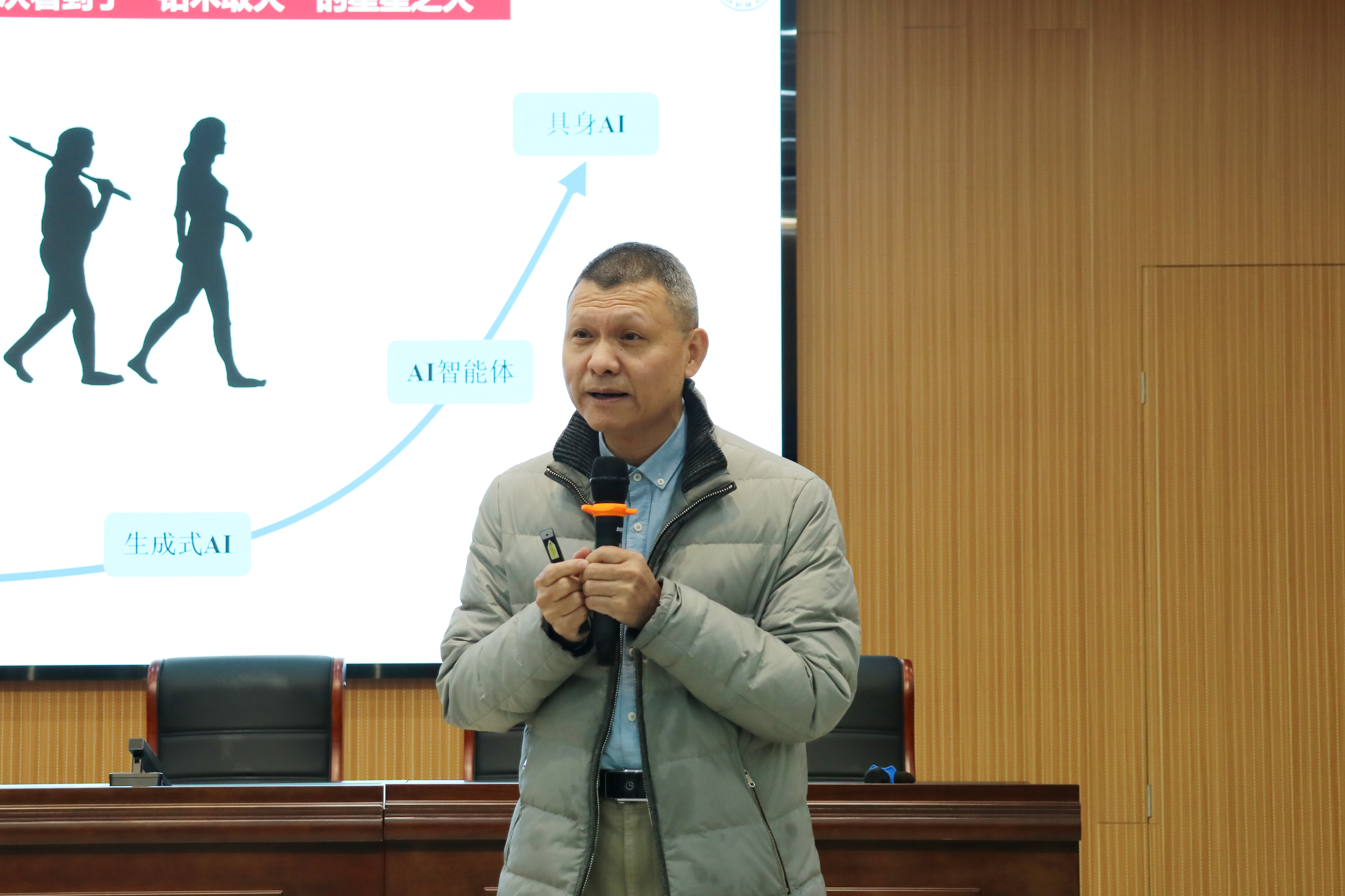 张文宇“脱口秀式”的幽默演讲,瞬间点燃全场热情,笑声与掌声此起彼伏。他以AI发展历程为切入点,清晰梳理出从感知AI、生成式AI、智能体到具身AI的进化脉络,并结合2022年ChatGPT横空出世、2023年国产大模型相继亮相、2025年Deepseek实现中美AI技术无代差赶超等鲜活案例,为学子们勾勒出直观的AI“进化图谱”,让抽象技术概念变得可感可知。不同于传统讲座的单向输出,这场演讲更像是沉浸式思想碰撞,始终紧扣“AI时代人类的护城河”核心命题,在案例解析与互动探讨中引导学子深思:当AI能编程、会创作,人类的独特价值究竟何在?AI时代人类的护城河在哪里?