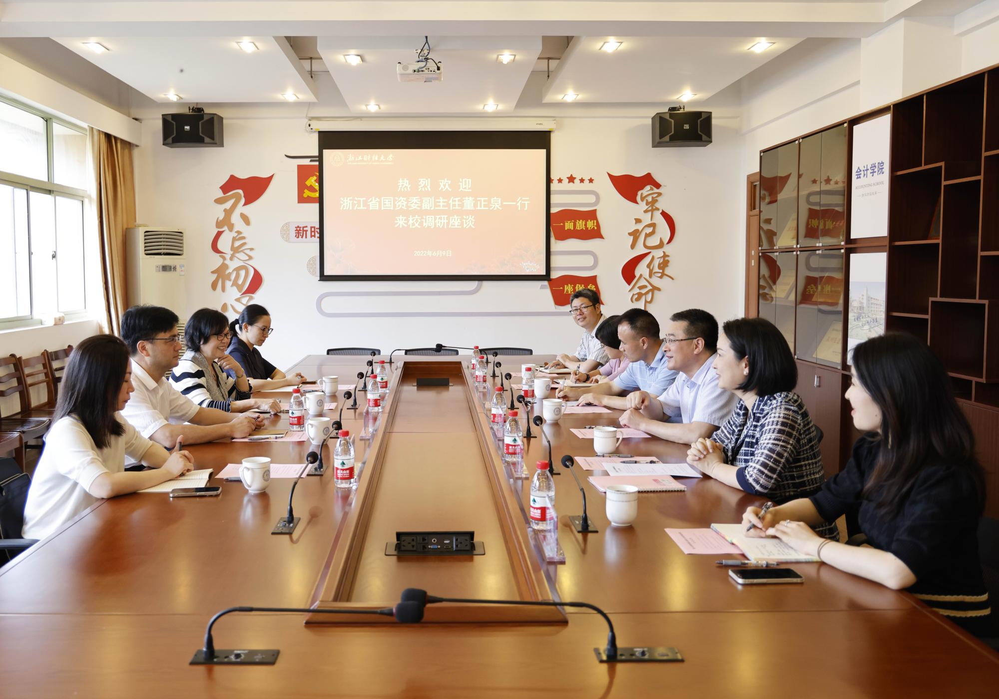 本网讯 6月9日,省国资委副主任董正泉、省总会计师协会常务副会长俞乐平、省国资委财评处处长曹晓蓓、省国资委财评处副处长陈梅等来校调研。校党委委员、副校长徐晓东热情接待了来访客人。
