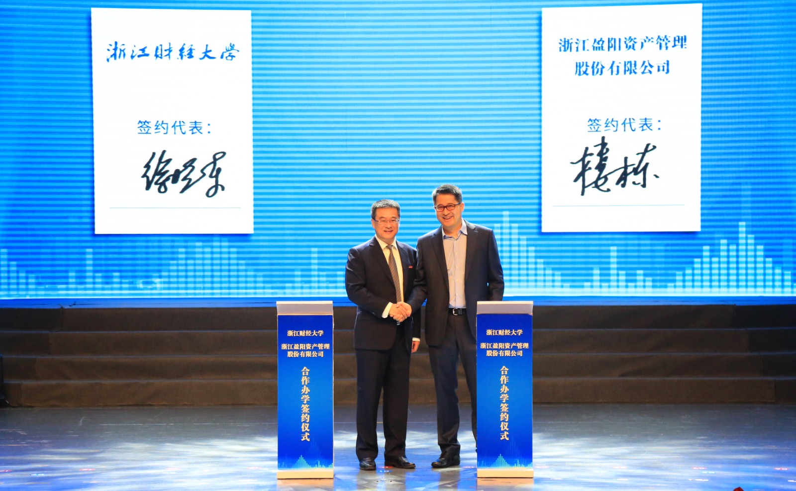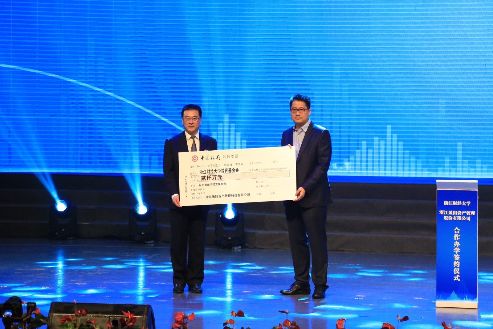 下沙校区举行。浙江盈阳资产管理股份有限公司创始人楼栋校友、管理层孔繁岗校友,李金昌书记、钟晓敏校长等全体党政领导班子成员,校友总会副秘书长、相关职能部门负责人,校友和师生代表参加了仪式。
