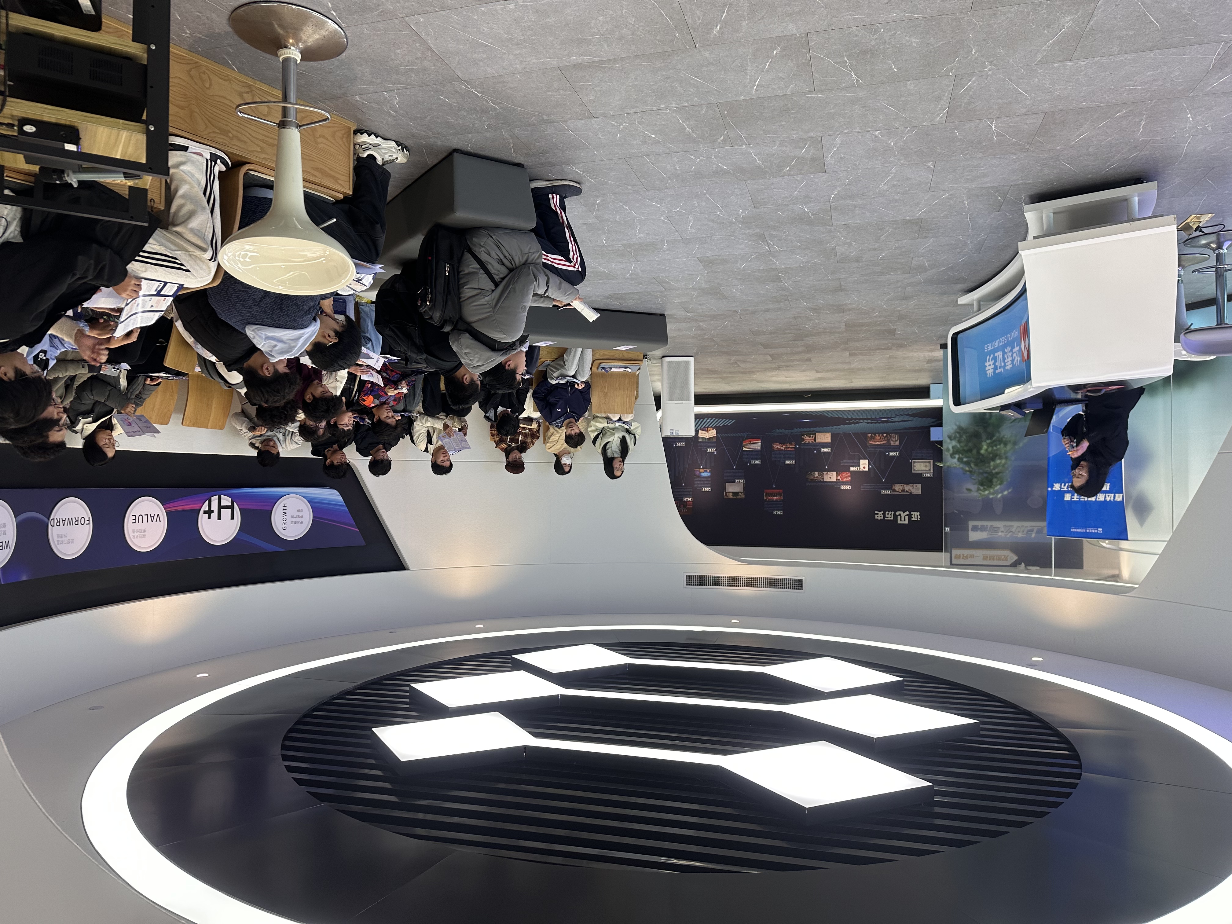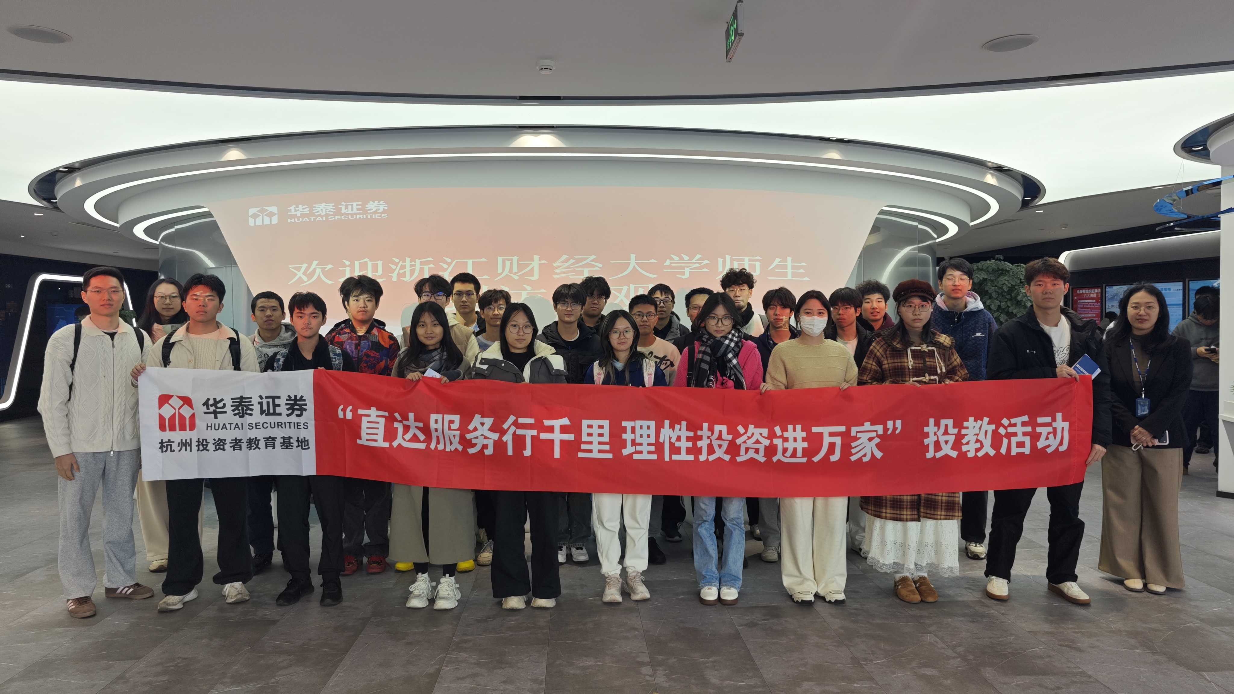 华泰证券浙江分公司投资者教育岗凌雨虹全方面带领同学们参观华泰证券投资者教育基地,通过历史回顾区、风险警示区、投资必知区、互动体验区充分接触证券投资行业,感受金融反哺实体企业、反哺社会的意义。