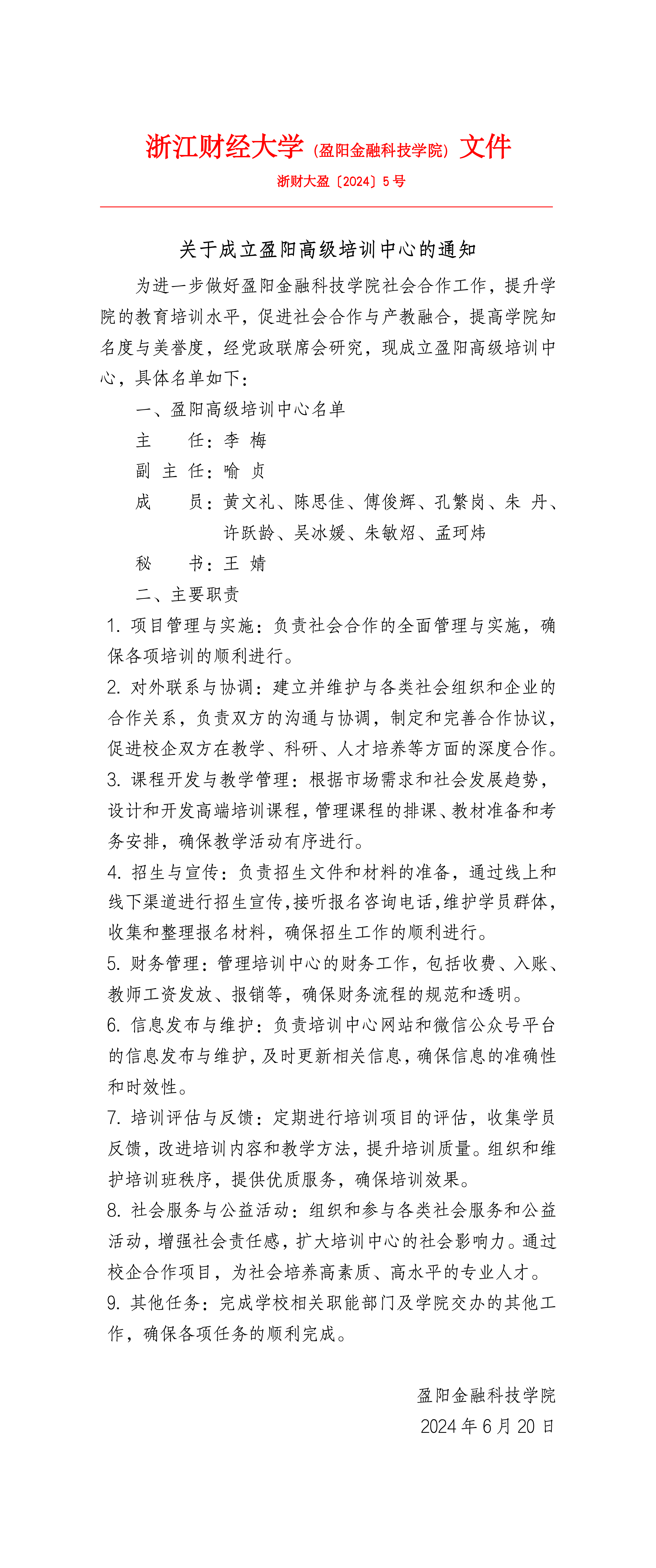 关于成立盈阳高级培训中心的通知