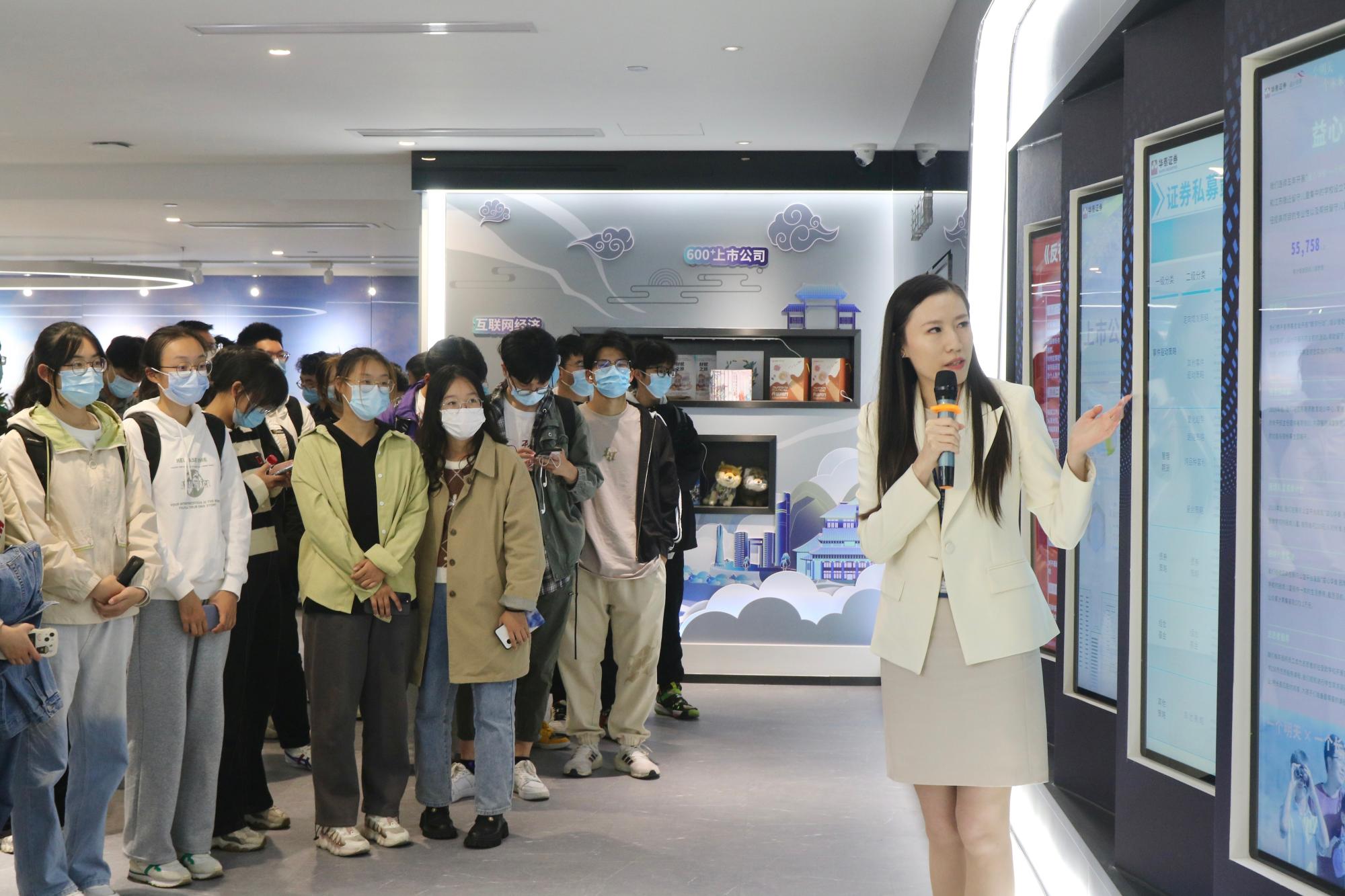 公司机构业务团队负责⼈吴迪全方面带领同学们参观华泰证券投资者教育基地,通过历史回顾区、风险警示区、投资必知区、互动体验区充分接触证券投资行业,感受金融反哺实体企业、反哺社会的意义。